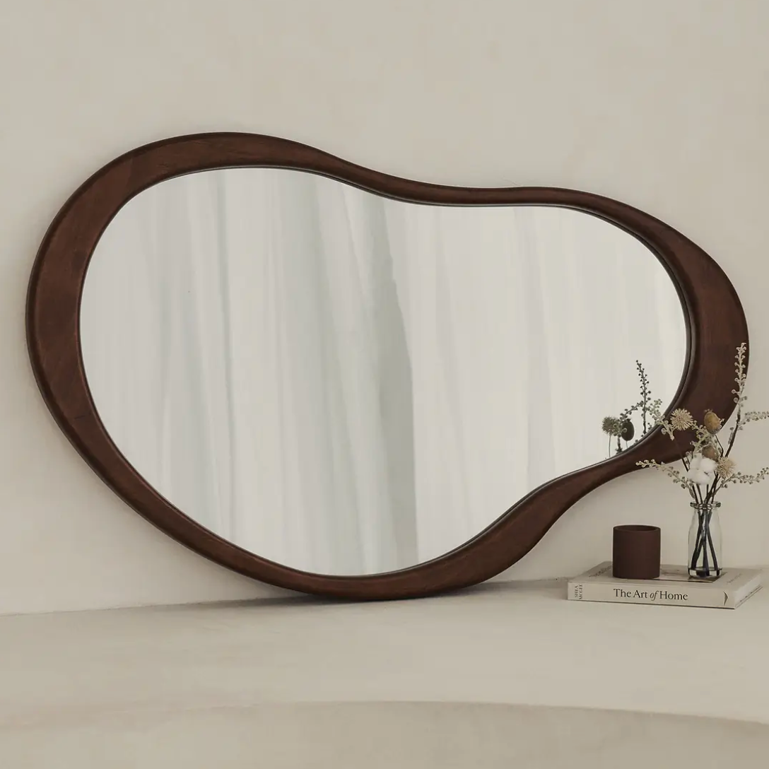 ARCVA - NESTANDARTINĖS FORMOS PAKABINAMAS/PASTATOMAS MEDINIS VEIDRODIS, TAMSAUS MEDŽIO ATSPALVIO, 130x80 CM