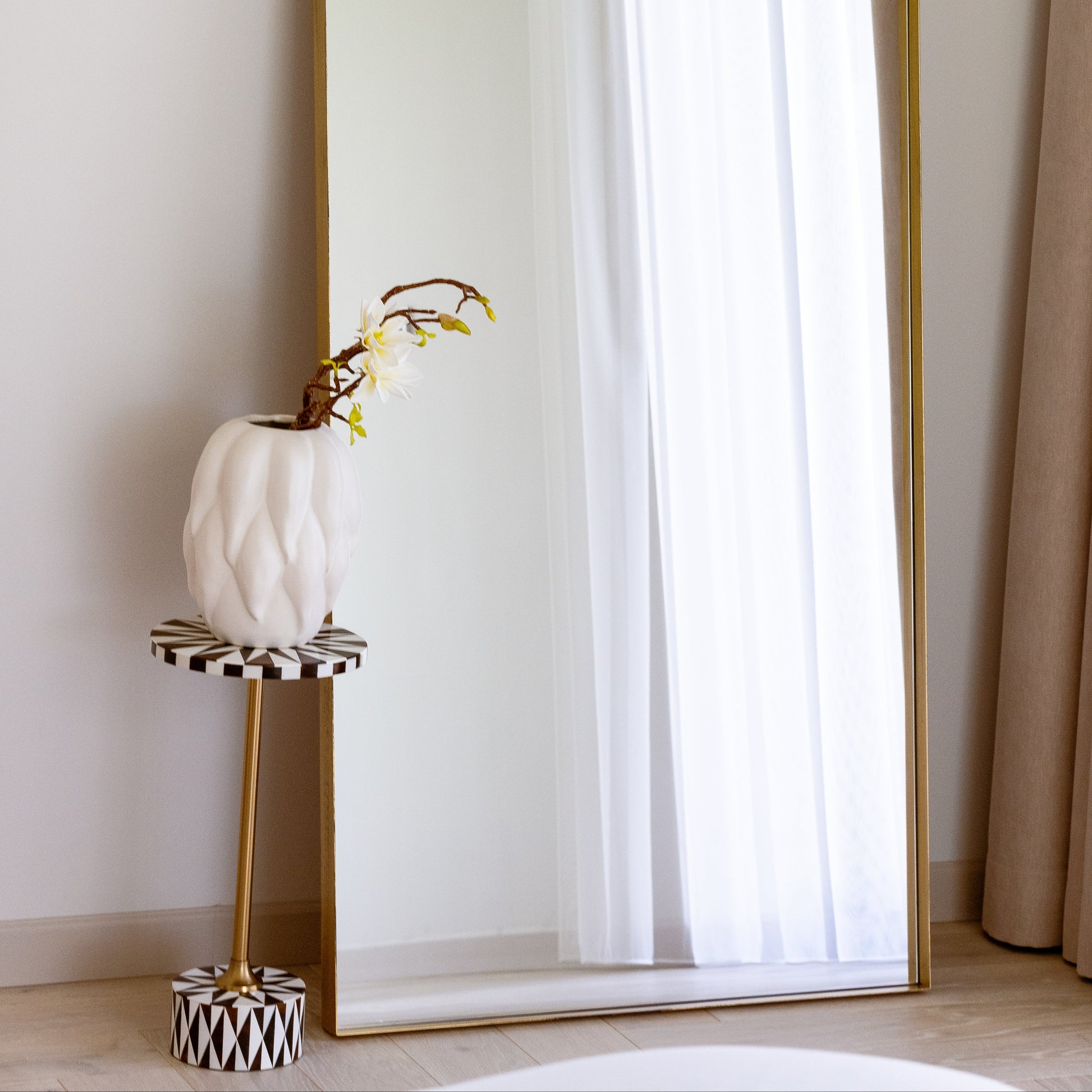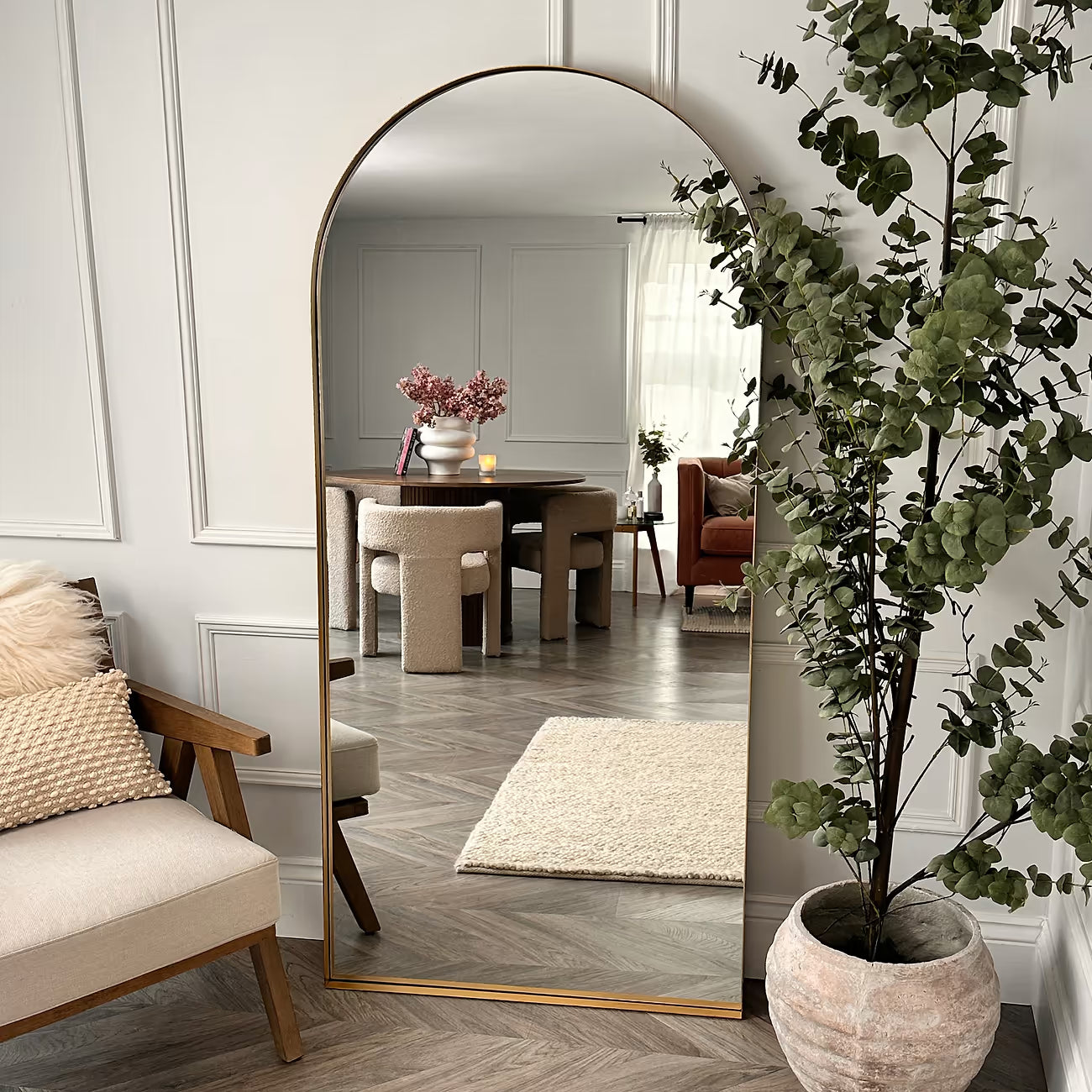 Minimalistinio stiliaus, masyvus, arkos formos veidrodis. Auksinio metalo krašteliai padės sukurti modernų ir paprastumu alsuojantį įvaizdį. Tvirtinasi prie sienos arba statosi ant grindų. Viso ūgio veidrodis.