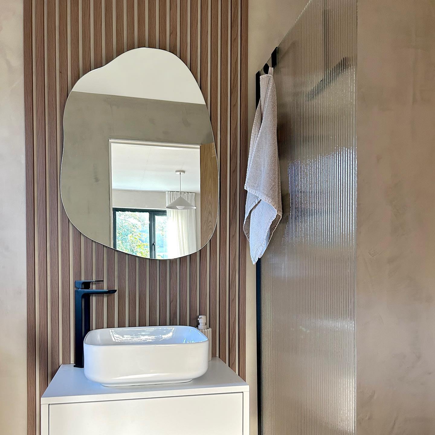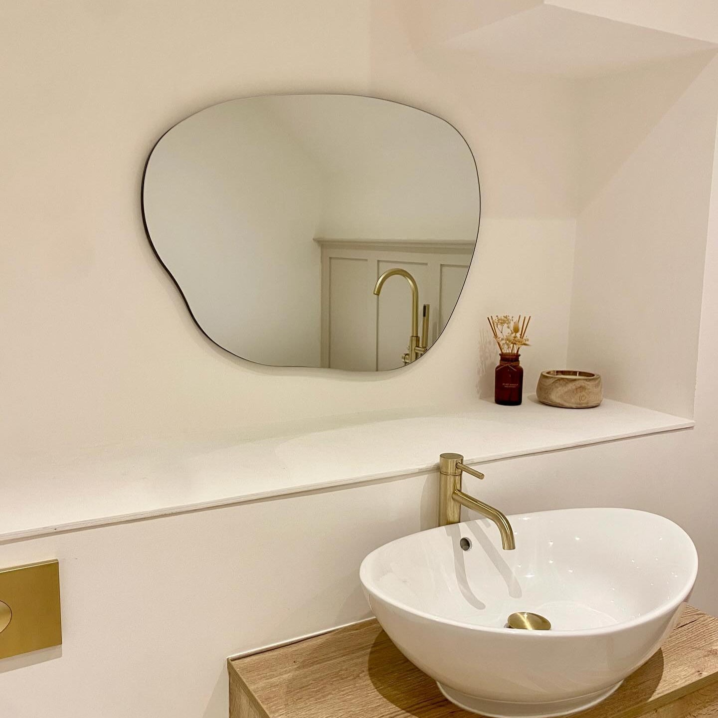 Minimalistinio stiliaus, nestandartinės formos veidrodis. Juodo metalo krašteliai padės sukurti modernų ir paprastumu alsuojantį įvaizdį. Tvirtinasi prie sienos arba statosi ant spinteles.
