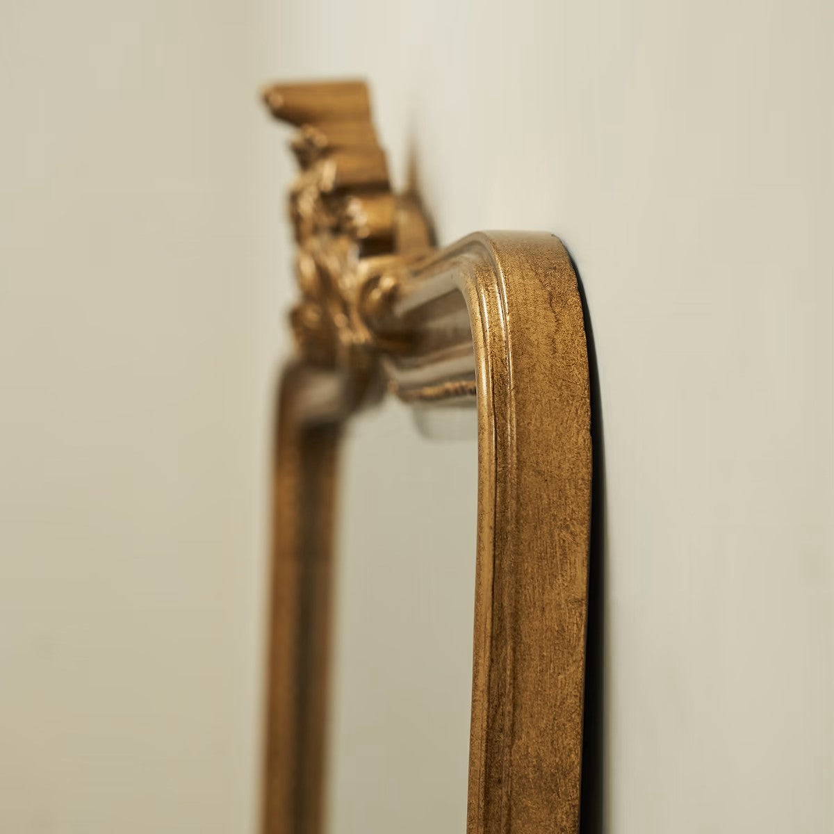 Vintažinio stiliaus, masyvus, netaisyklingos arkos formos veidrodis su papuošimais. Auksiniai medinio rėmo krašteliai padės sukurti modernų ir paprastumu alsuojantį įvaizdį. Tvirtinasi prie sienos arba statosi.