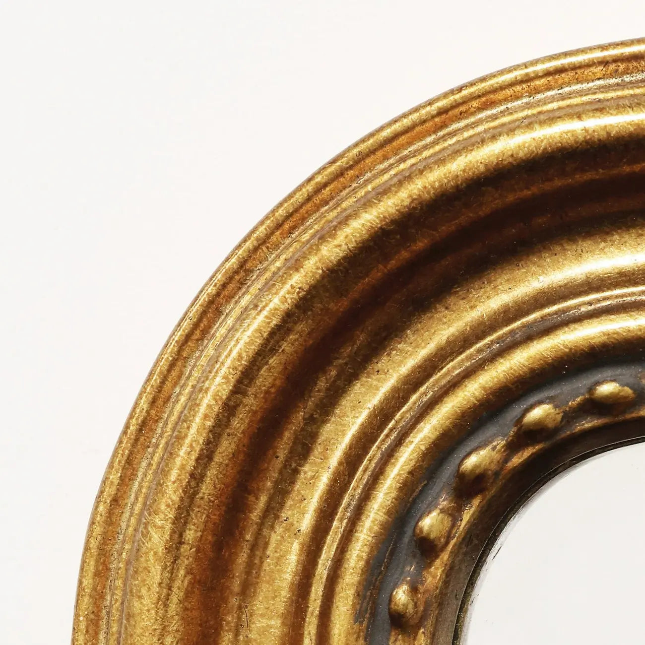 Vintažinio stiliaus, masyvus, netaisyklingos arkos formos veidrodis su papuošimais. Auksiniai medinio rėmo krašteliai padės sukurti modernų ir paprastumu alsuojantį įvaizdį. Tvirtinasi prie sienos arba statosi ant grindų.